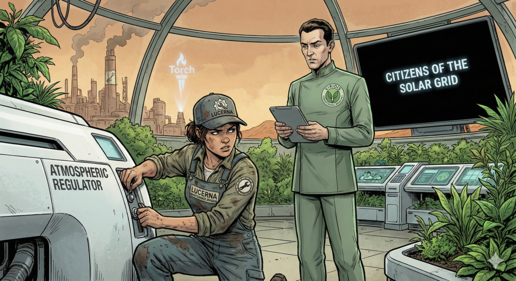 The air in the corridor was thinner than inside her room. Safe, but thin. She pulled her rebreather mask from her belt loop and sealed it over her nose and mouth with a practiced click. You didn’t need a pressure suit on Mars anymore—thanks to Viridis pumping CO2 into the atmosphere for fifty years—but unless you wanted altitude sickness in ten minutes, you wore the mask.